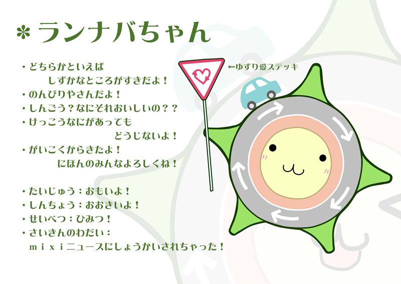 「ランナバちゃん」は,日本でのラウンドアバウト普及のため,(公財)国際交通安全学会(IATSS)H2425プロジェクト「安全でエコなラウンドアバウトの実用展開に関する研究」の協力のもと考案されたマスコットキャラクターです. ☆随時コンテンツ追加予定!☆